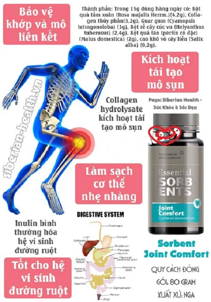 Đầu tiên là sản phẩm Essential Sorbents Joint Comfort: sẽ giúp bạn bảo vệ khớp và mô liên kết, kích hoạt tái tạo mô sụn, tạo màng khớp, Hạn chế thoái hóa, viêm khớp, bảo vệ khớp, làm sạch cơ thể và các dịch khớp, đào thải các acid uric lắng đọng trong khớp, có tác dụng giảm đau, làm sạch và tăng cường hệ vi sinh đường ruột.